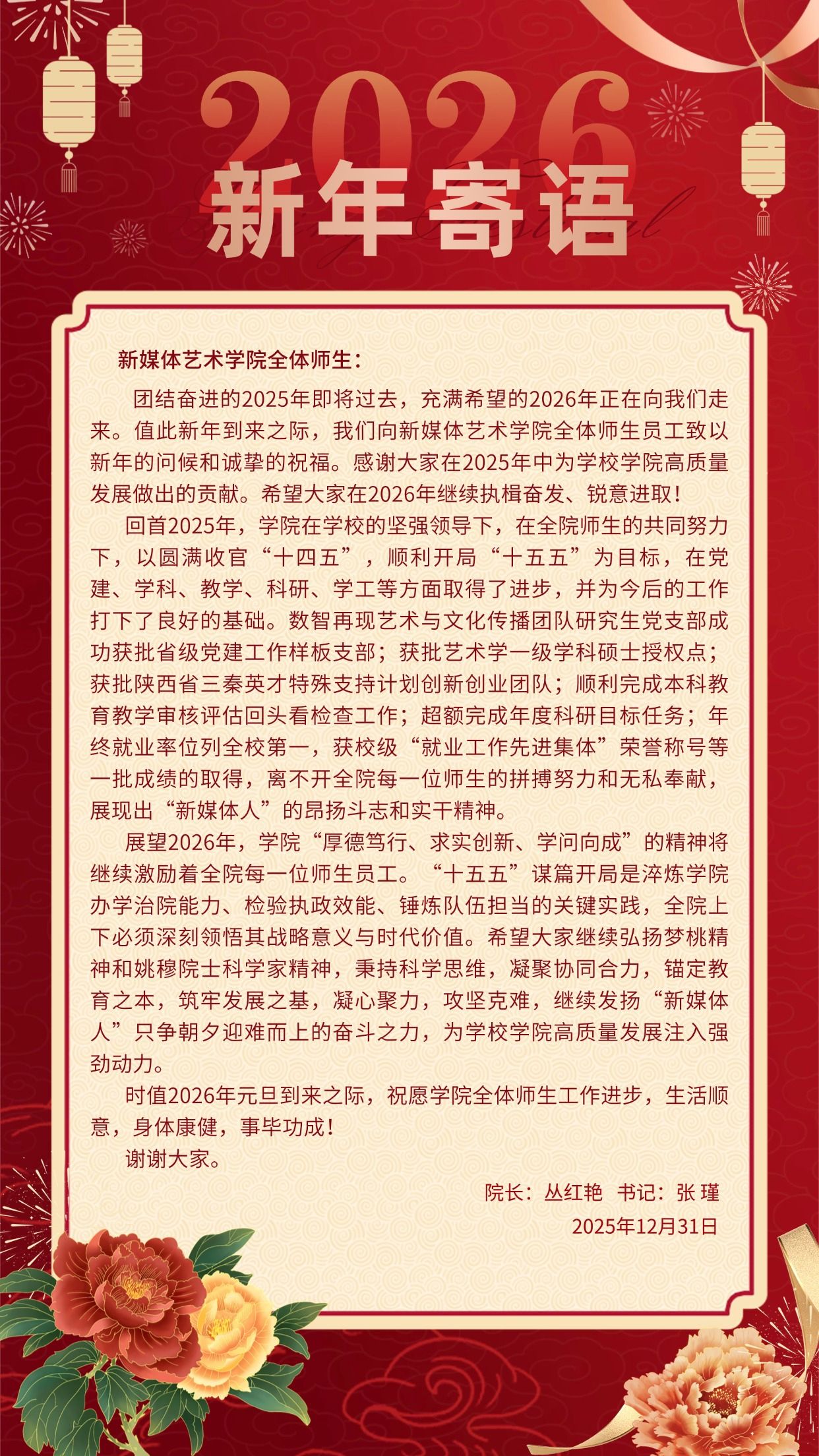 团结奋进的2025年即将过去,充满希望的2026年正在向我们走来。值此新年到来之际,我们向日本三级 全体师生员工致以新年的问候和诚挚的祝福。感谢大家在2025年中为学校日本三级 高质量发展做出的贡献。希望大家在2026年继续执楫奋发、锐意进取!